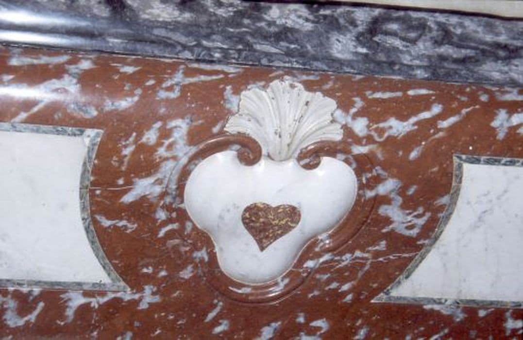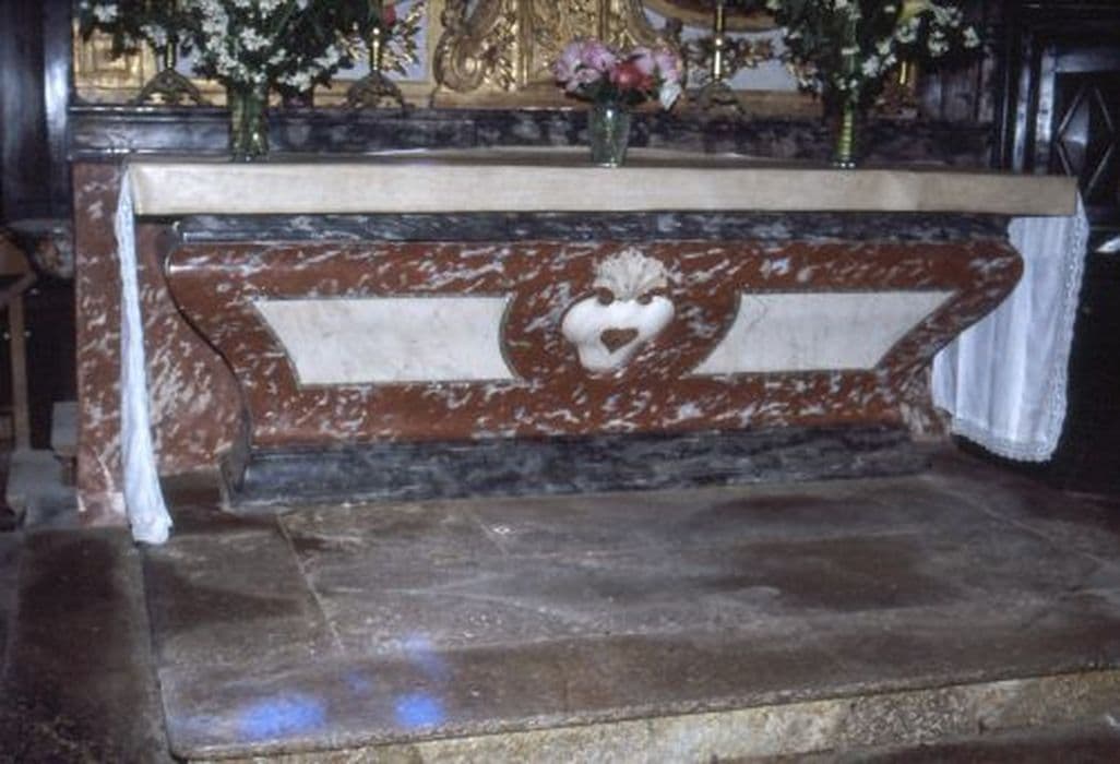 Autel en marbre rouge et blanc. Au centre, médaillon avec un coeur en marbre rouge, du 18e siècle. tabernacle en bois doré orné de guirlandes du 17e siècle.