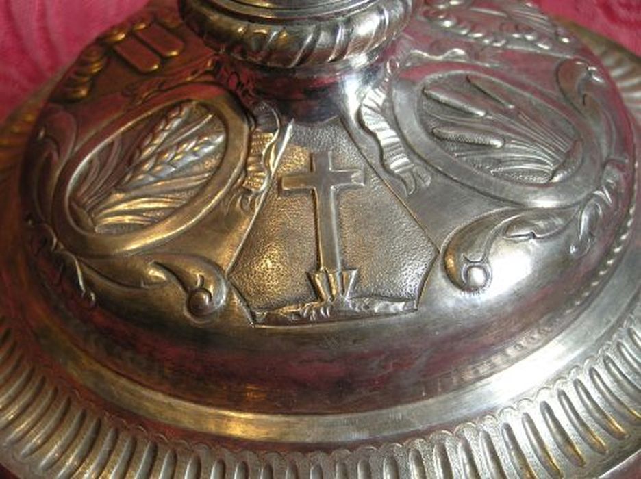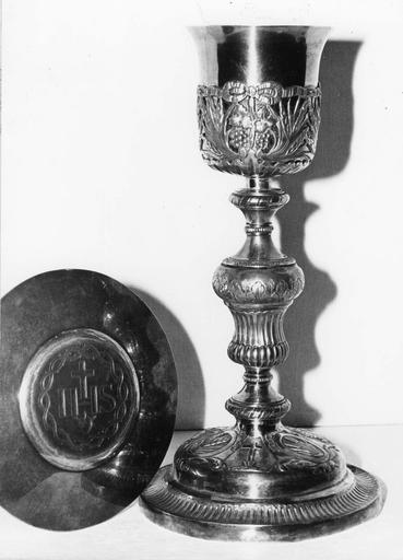 Avec fausse coupe ajourée à noeud de rubans, blé, vigne. Noeud en partie cannelé. Bout du pied cannelé. Pied avec croix, raisins, roseaux, blé. Noeud piriforme entre deux collerettes torsadées.