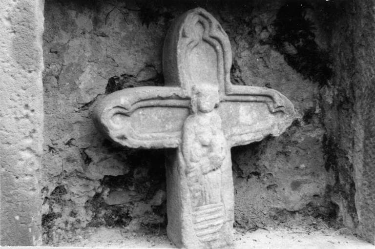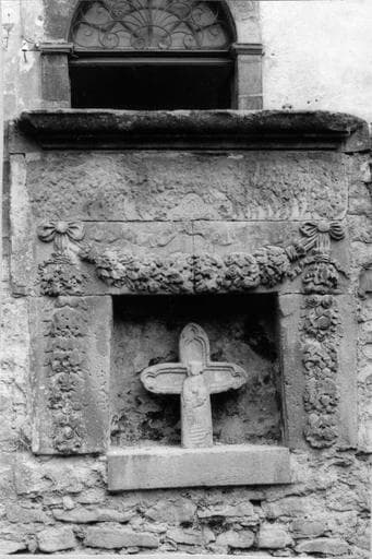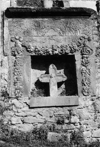 Croix en pierre sculptée du 14e siècle et son encadrement en pierre du 18e siècle. L'encadrement se compose de grandes pierres portant des sculptures en bas-reliefs formés de guirlandes de fleurs et de feuillages noués de rubans. Ces pierres semblent provenir d'une ancienne porte. La croix, nichée dans le creux formé par les pierres, porte en son centre une effigie en relief qui peut être celle de Notre-Dame-de-Camon. Autre face avec le Christ.