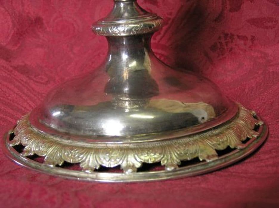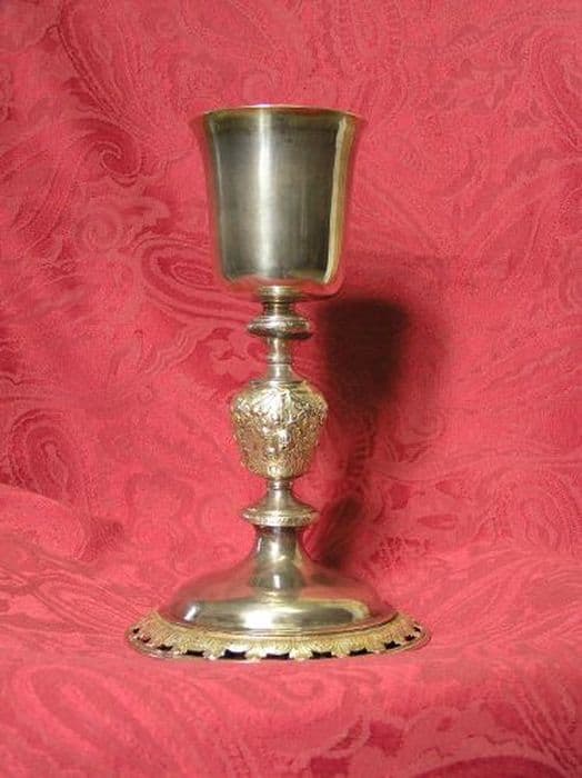 Calice en argent, pied bordure ajourée, noeud avec fruits et tête d'anges, coupe unie en argent doré. Patène en argent et vermeil.