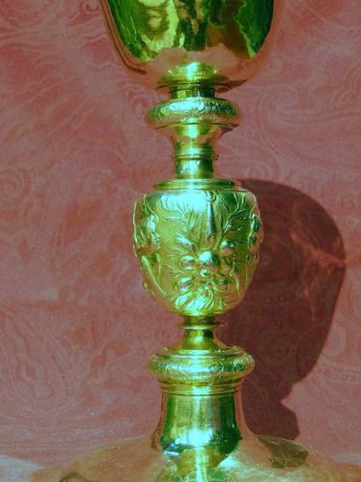 Calice vermeil à coupe unie, pied à dix lobes, noeud à fruits et draperies. Patène unie.