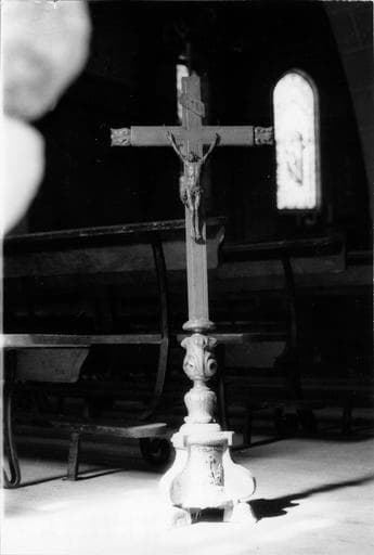 Extrémité des bras ornée d'une tulipe fermée. Vêtement du Christ bouffant à gauche. Pied cylindrique complété de trois volutes terminées en griffes d'animal. Croix et feuillages sur les trois faces.