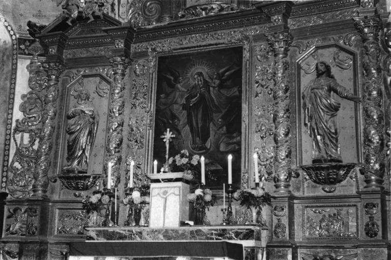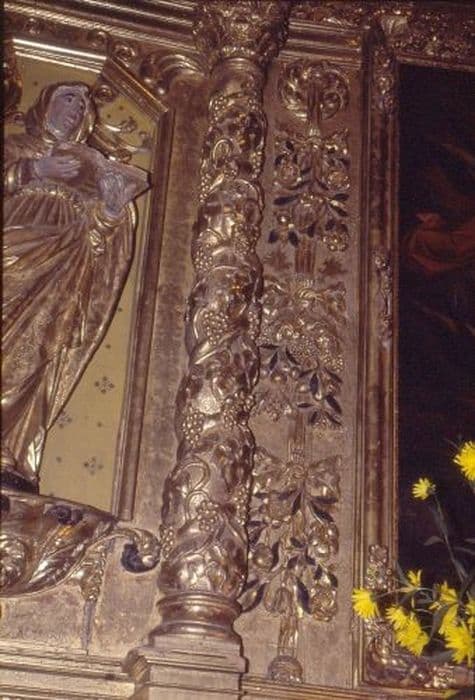 Registre inférieur : deux panneaux illustrés avec à droite, la Visitation et à gauche, l'Annonciation et au centre, un panneau simplement orné de floraison, registre supérieur : trois panneaux, avec à droite, la statue de Jésus Christ, au centre, une peinture de la Vierge de gloire, à gauche, une statue de la Vierge. Les panneaux sont placés entre quatre colonnes torsadées, ornées de feuillages.