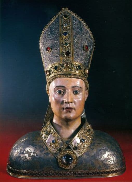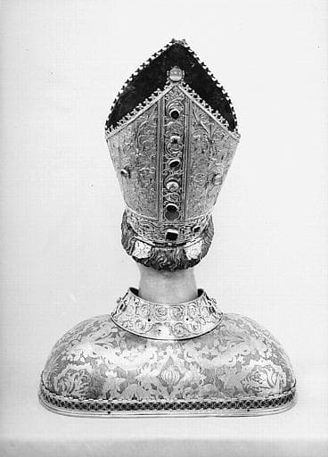 Buste en argent doré, mitre et vêtements à rinceaux filigranés et pierres serties dans des bates, visage peint au naturel.