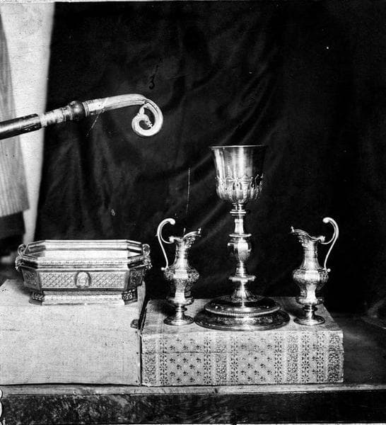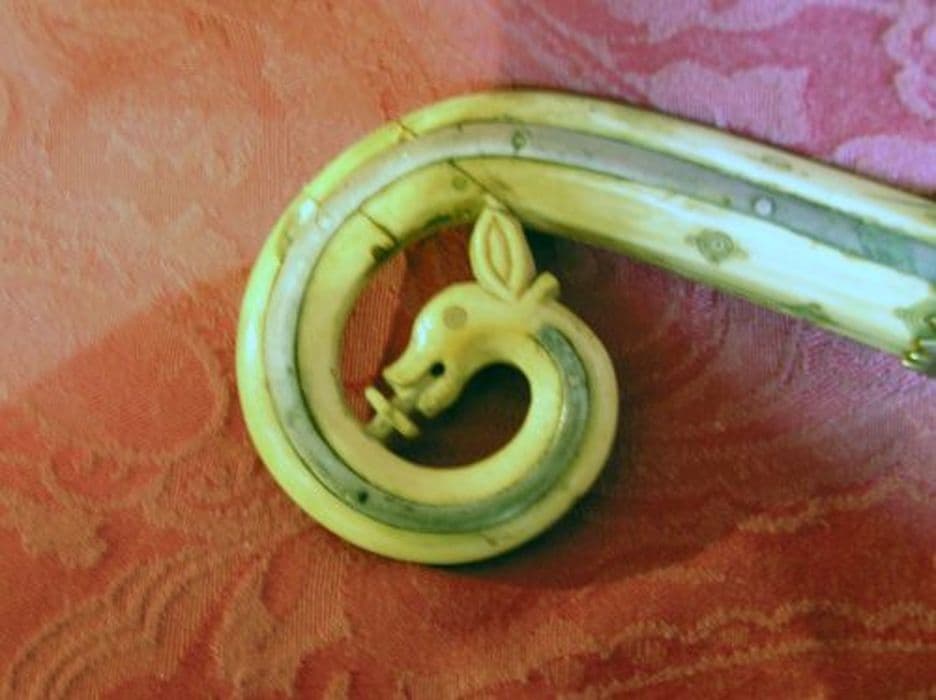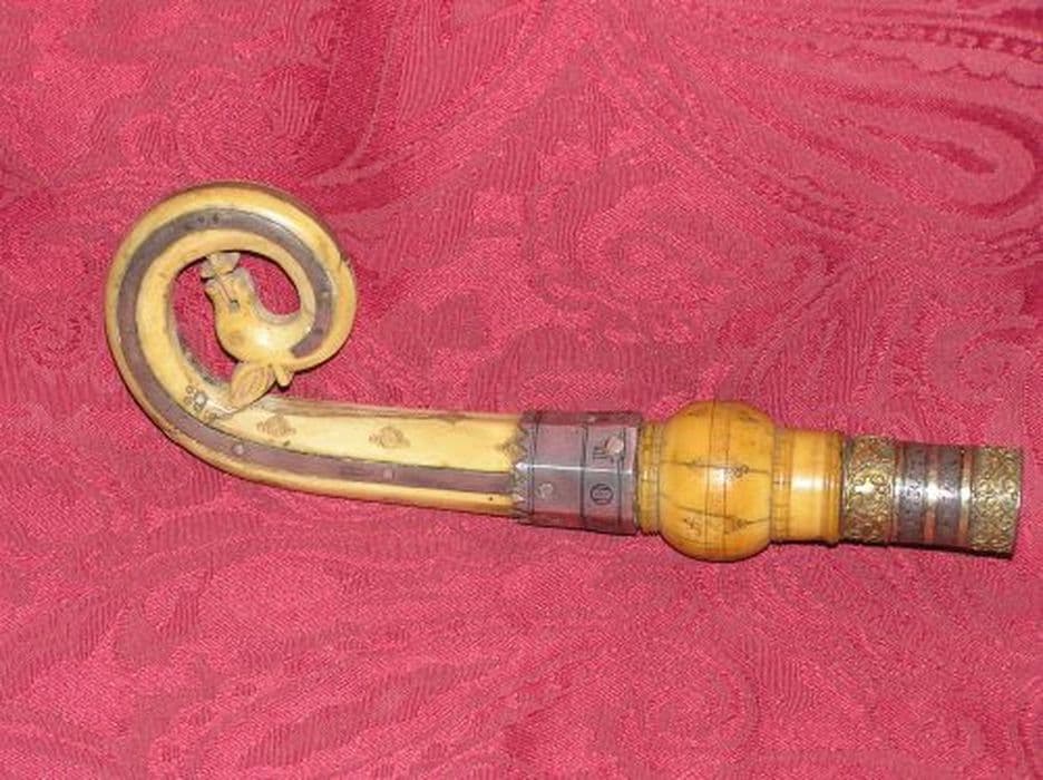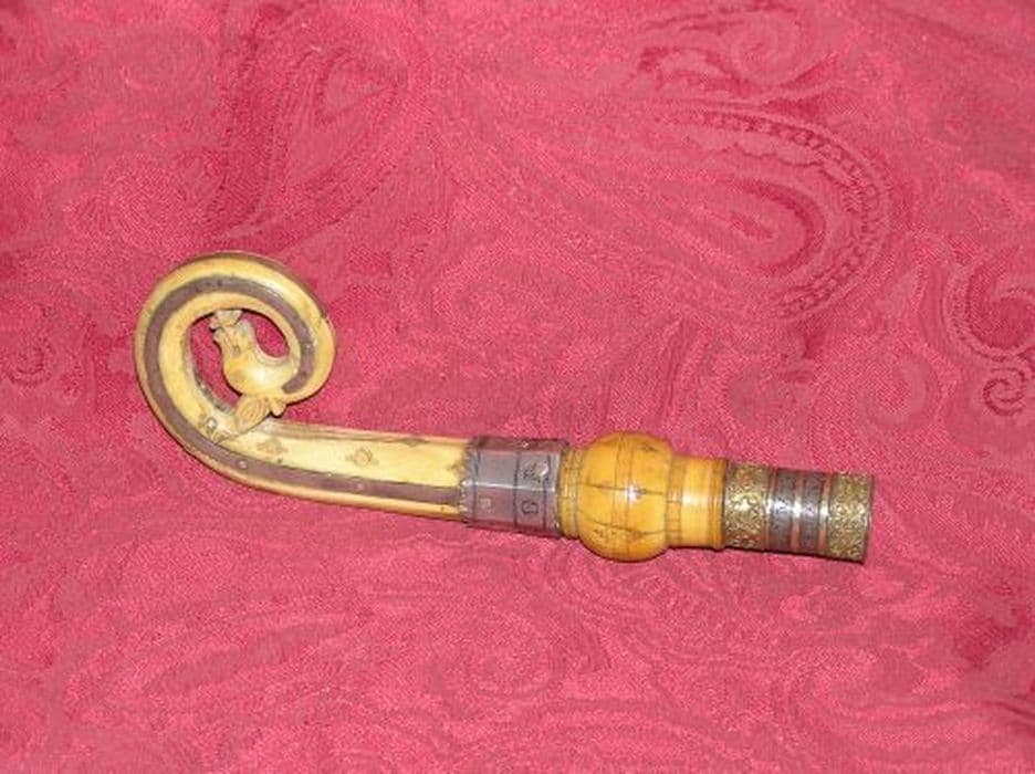 Crosse en ivoire. Tige octogonale ornée de petits cercles en creux, emboîtée dans une gaîne d'argent. Bâton en bois portant trois anneaux d'argent, dont deux sont dorés.