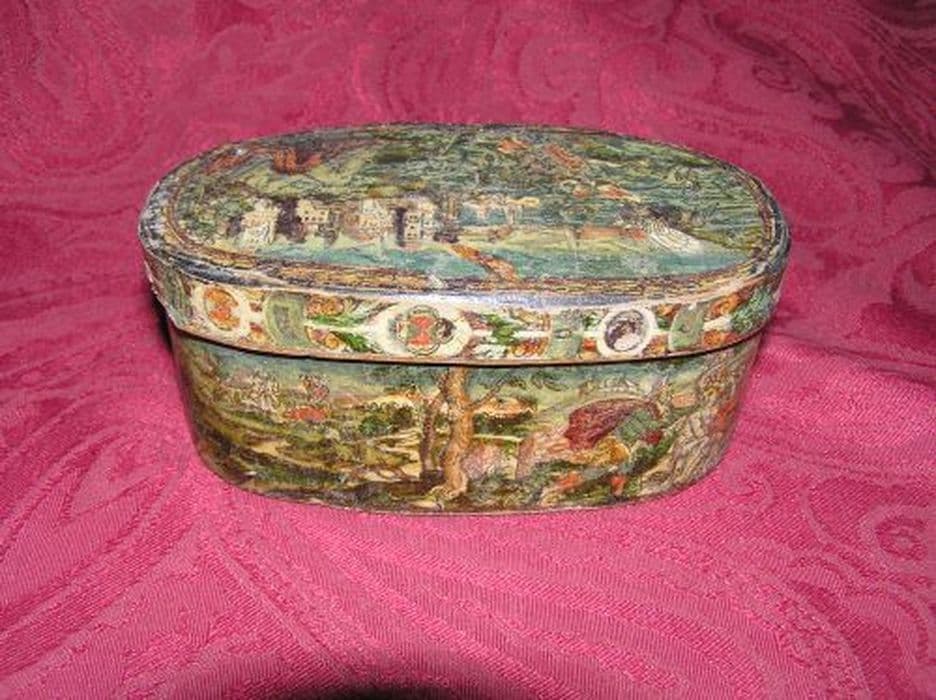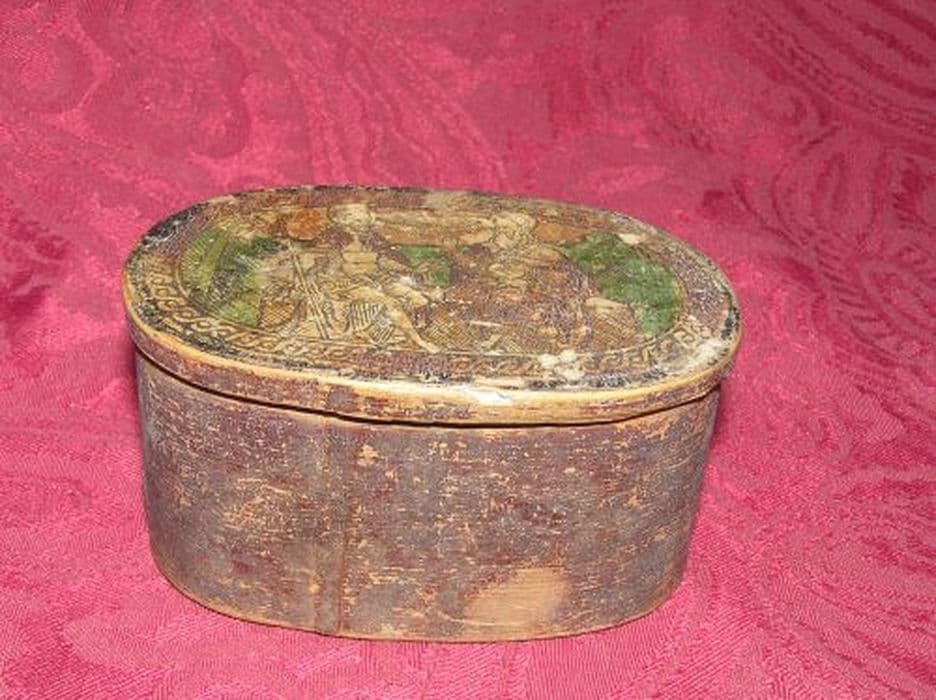 Boîtes ovales en lamelles de bois à décor de gravures collées et coloriées : la Trinité, deux femmes assises, Histoire de Jonas (couvercle) et Histoire de Suzanne (sur les côtés).