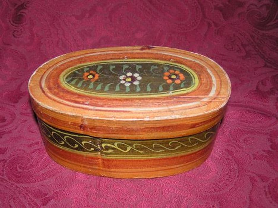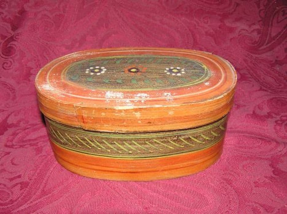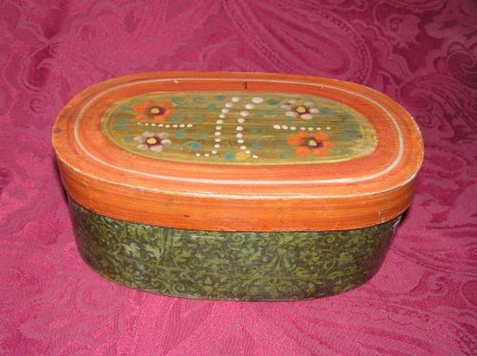 Boîtes ovales en lamelles de bois peint à décor de bandes et de fleurettes.
