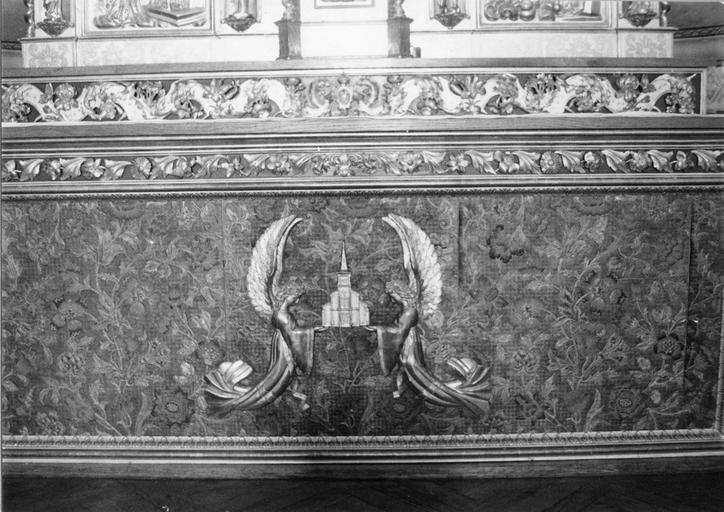 Cuir de Cordoue du 17e siècle orné d'un décor de fleurettes et de feuillages, bleu et or sur fond rouge, du 19e siècle. Au centre, une église en or tenue par deux anges aux longues ailes d'or.