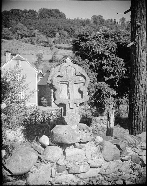 Croix en pierre de grès bleuté sculptée portant sur une face le Christ en croix et sur la face opposée la Vierge à l'Enfant. Sur cette face la Vierge porte une haute coiffure qui paraît être une couronne, l'enfant tenu sur le bras gauche, est longuement vêtu. Le Christ est naïf, tête penchée à droite et longue chevelure, bras horizontaux ressemblant un peu au Christ en bois du 15e qui se trouve à l'intérieur de l'église. Les deux personnages sont dans une sorte de gloire formée par un bourrelet en relief de la pierre de forme pentagonale pour le Christ et plus découpée pour la Vierge.