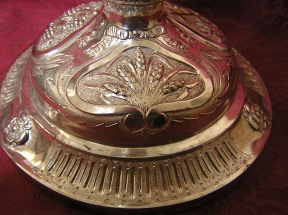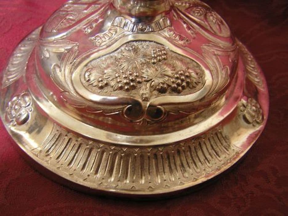 Calice argent à coupe dorée. Fausse coupe ajourée à noeuds de rubans blé et vigne, noeud ovoïde cannelé, croix au pied.