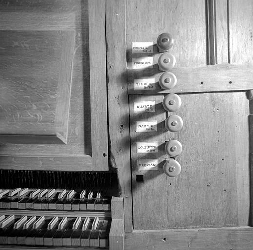 La console, en fenêtre, comporte deux claviers manuels (grand orgue, 8 jeux ; récit, 4 jeux) et un pédalier à la française.