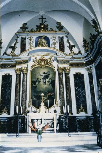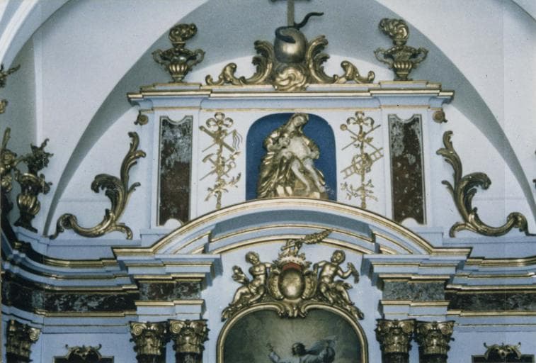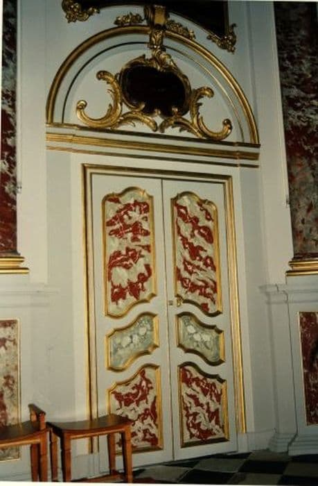 Base de panneaux de marbre rouge et noir. Motif central : quatre colonnes de marbre rouge, encadrant une toile peinte, surmontées de chapiteaux composites dorés. Partie intermédiaire ornée d'un panneau de marbre noir. Entablement en chapeau de gendarme, surmonté d'un panneau chargé de deux plaques de marbre rouge. Côtés latéraux englobant une porte de syle Louis XVI, à panneaux de faux marbre rouge et gris, surmontée d'une imposte demi-circulaire, elle-même sommée d'une toile peinte ; le tout cantonné de deux pilastres en marbre rouge terminés par des chapiteaux composites dorés. Inventorié au n°4489.