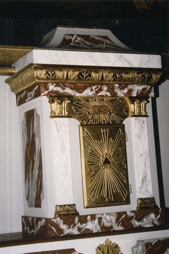 Tabernacle en bois doré et imitation marbre, décoré de deux pilastres à chapiteaux corinthiens, porte de forme rectangulaire et en bois doré. Inventorié au n°4505.