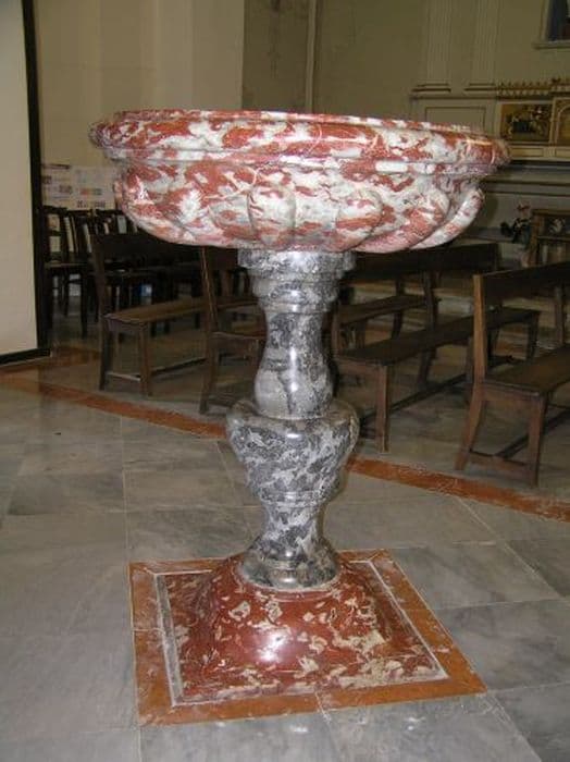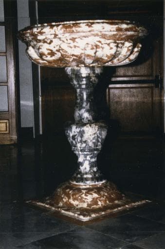 Bénitier en marbre : cuve et sol en marbre rouge veiné de Caunes Minervois, fût en marbre gris veiné. Inventorié au n°4511.