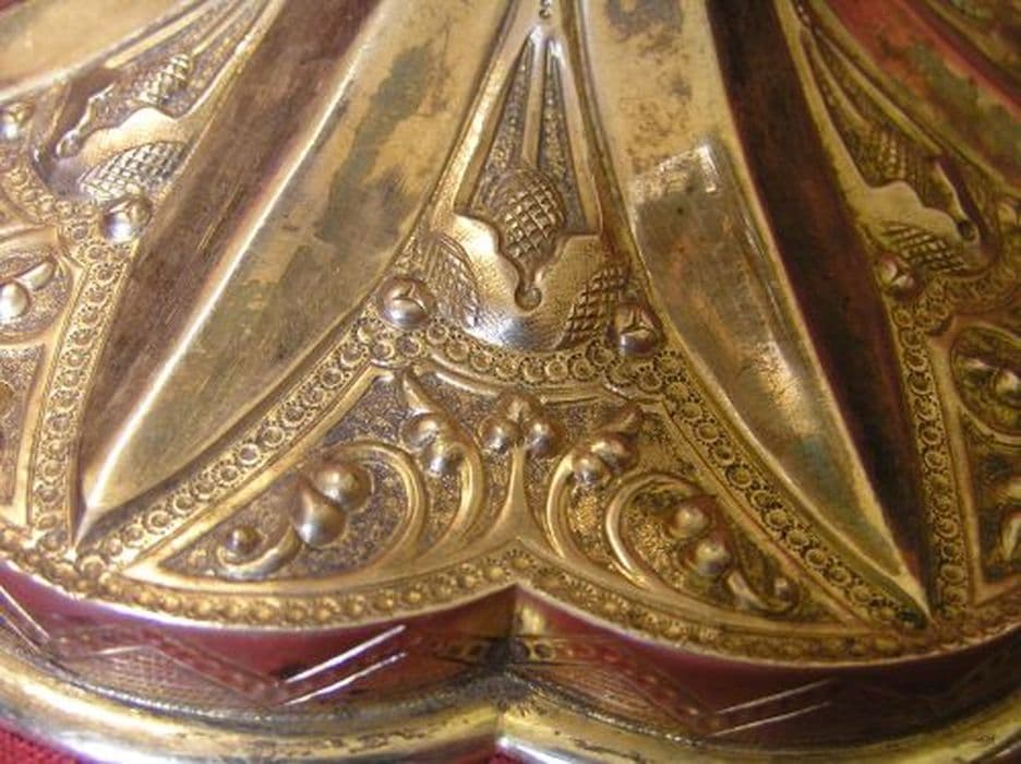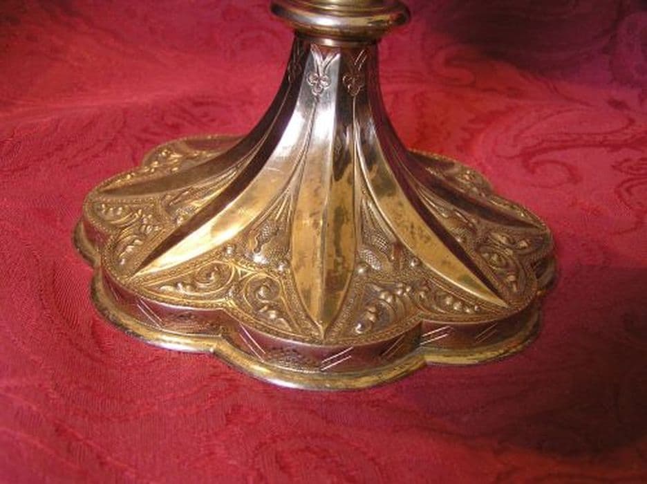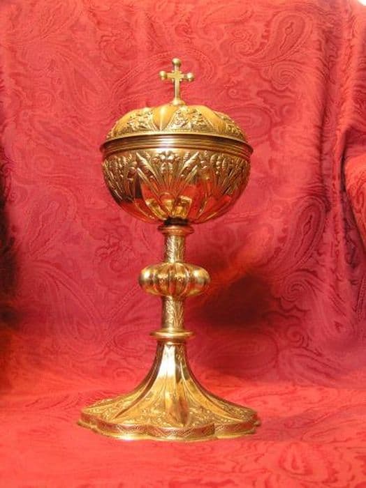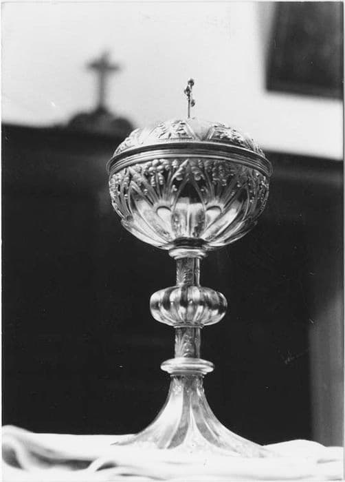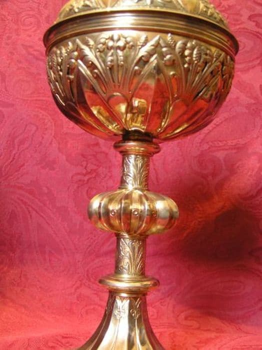 Ciboire néo-gothique en argent doré. Pied octolobe à la bordure plate décorée d’un filet double en dent de scie. Dessus décoré de rinceaux insérés entre huit palmes lisses se rejoignant pour former le fût. Collerettes basse et haute lisses. Fût cylindrique orné d’un motif végétal gravé. Noeud à côtes de melon. Cuve chargée de motifs de végétaux stylisés. Couvercle décorée de rinceaux insérés entre huit palmes rayonnantes. Croix bourdonnée.