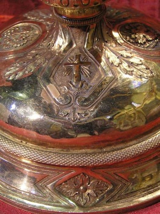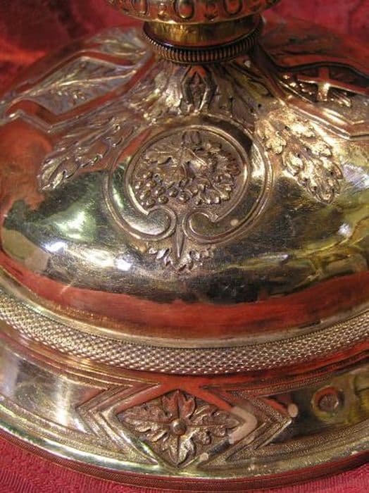 Pied circulaire au redent concave chargé de quatre cartouches vierges alternant avec quatre rosaces dans un losange. Dessus bombé orné de deux cartouches baroques en forme de losange, abritant une croix latine fichée rayonnante, une composition formée d’une masse de roseau et de deux épis de blé, et deux médaillons ovales enserrant une grappe de raisin feuillée, alternant avec des feuilles d’acanthe stylisées, l’ensemble bordé d’un ruban. Collerettes basse et haute perlées. Noeud en forme d’urne décorée de feuilles d’acanthe et chargé de deux cartouches baroques en forme de losange, abritant une composition d’une masse de roseau et de deux épis de blé et deux médaillons ovales enserrant une grappe de raisin feuillée, alternant avec des feuilles d’acanthe stylisées. Fausse coupe ajourée à feuilles d’acanthe alternant avec trois médaillons ovales abritant : un buste de Christ aux outrages, un buste de Vierge Marie, un coeur enflammé entouré d’une couronne d’épines, le tout sommé d’une croix latine. Coupe à bord évasé.