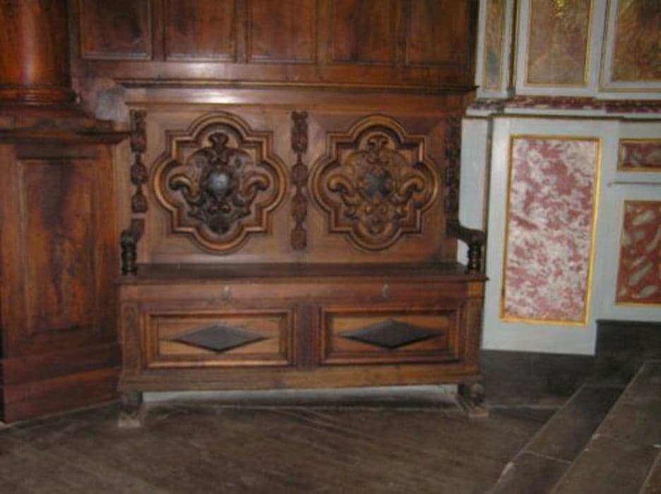 Banc d'oeuvre en noyer sculpté de cartouches et de panneaux en bas-relief.