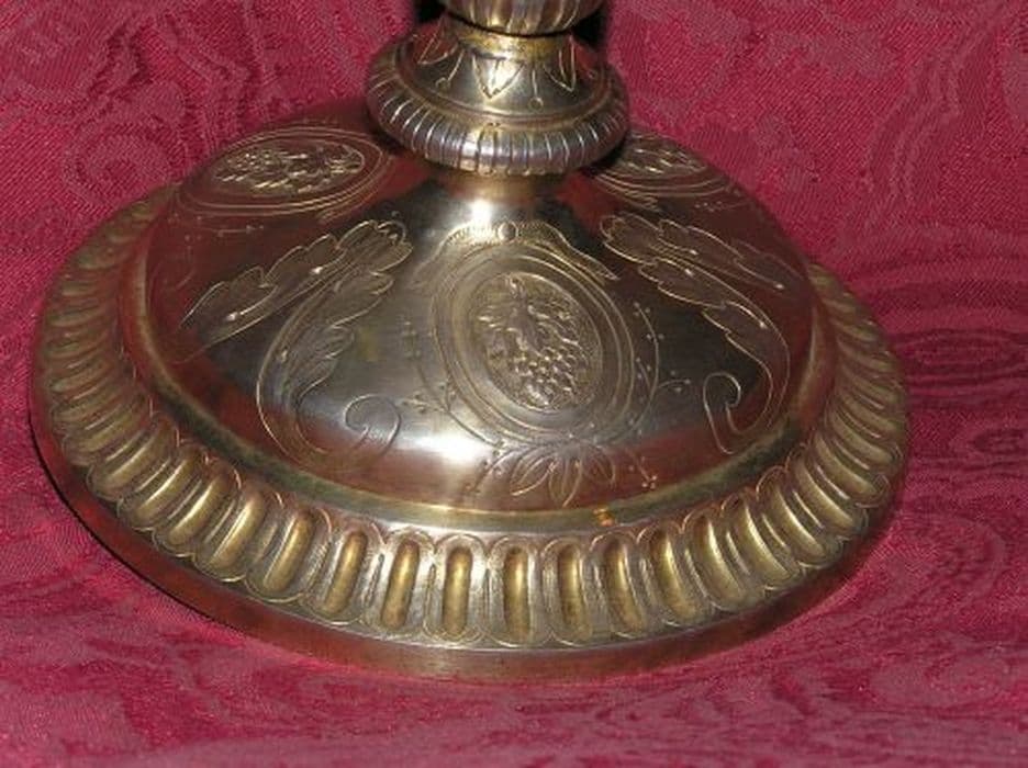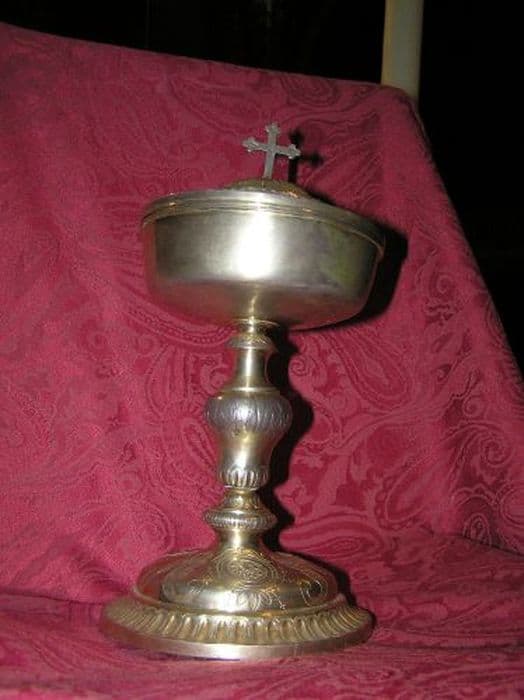 Ciboire en argent, anciennement doré. Pied circulaire au redent concave chargé de godrons en creux. Dessus bombé orné de trois grappes de raisin feuillées dans un médaillon ovale alternant avec des feuilles d’acanthe stylisées. Collerette basse striée. Noeud en forme d’urne décoré de godrons en creux à la base et de feuilles d’acanthe stylisées au sommet. Cuve semi hémisphérique aplatie lisse. Couvercle aux feuilles d’acanthe rayonnantes, bordé d’une bande de godrons en creux. Croix tréflée.