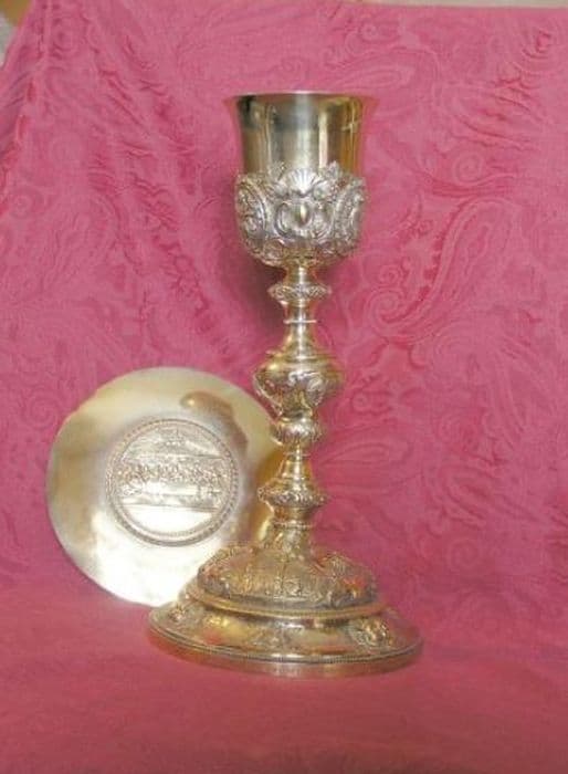 Calice et patène en argent doré. Pied circulaire lisse surmonté d’un filet perlé, la bordure supérieure concave chargée de trois têtes de deux anges affrontés posées sur des nuées rayonnantes, alternant avec trois motifs religieux, l’ensemble couronné par une frise de feuilles d’eau. Dessus très bombé frappé de trois scènes religieuses, le tout surmonté d’une fine collerette perlée. Collerettes basse et haute chargées de rubans enserrant des perles et des rosaces allongées. Noeud en forme de vase Médicis décoré à la partie basse de feuilles d’acanthe et à la partie haute de motifs liturgiques dans un médaillon en forme de coeur : épis de blé, grappes de raisin, masses de roseaux, le tout surmonté d’un filet de feuilles d’eau. Fine collerette striée. Fausse coupe ajourée ornée de médaillons ovales chargés de perles, séparés des décors baroques frappés d’un opercule et cantonnés au sommet de grappes de raisin feuillées. Coupe lisse à bord évasé.
