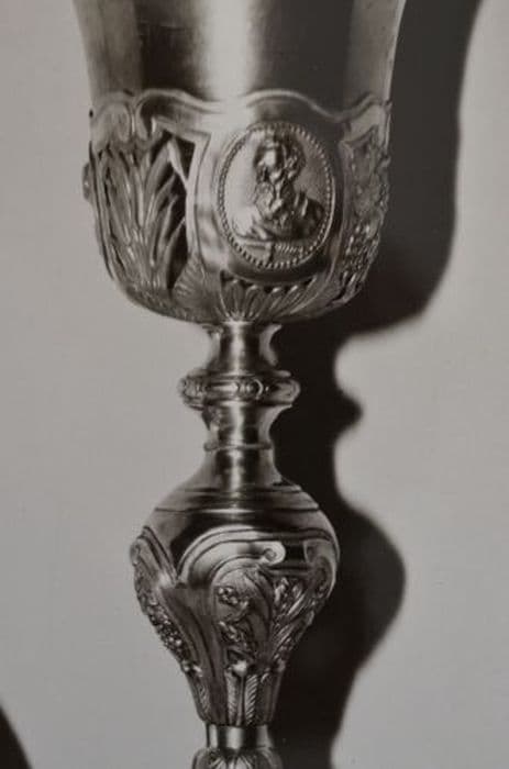 Calice en argent, à fausse coupe ornée de trois médaillons, noeud allongé et pied circulaire.
