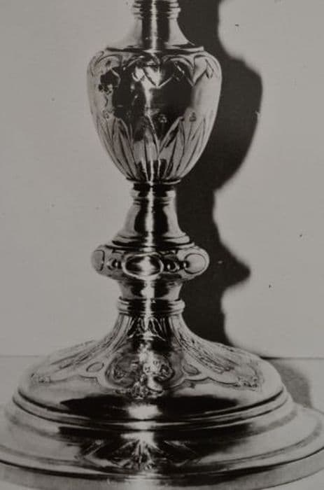 Calice en argent à décor gravé, coupe dorée. Fausse coupe ajourée à médaillons de raisins et de blé.