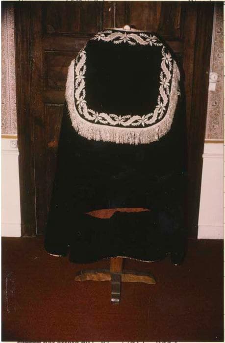 Chape en velours bleu profond. Orfrois et dosseret dessinés par des broderies de feuillages et d'épis en rubans entrelacés. Franges d'argent. Doublure noire.