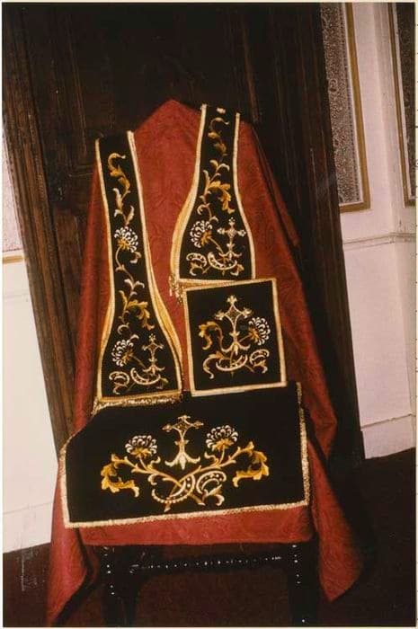 ornement liturgique catholique ; étole de clerc ; voile de calice ; manipule ; bourse de corporal