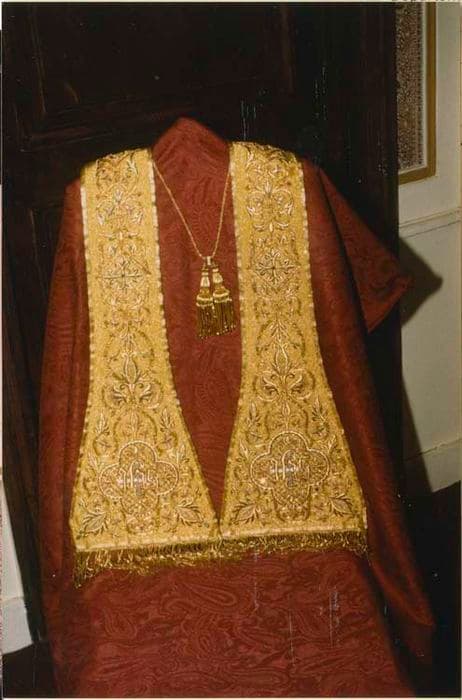 Etole pastorale en drap d'or. Broderie de ramages symétriques et de croisettes d'or, relevés de soies roses et bleues et chargés de pierres vertes, violettes et rouges. Franges et glands d'or. Doublure.