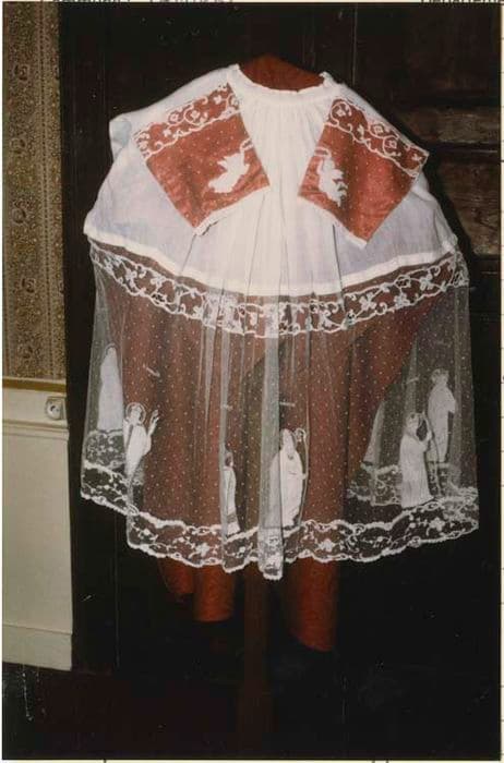 Rochet en dentelle sur tulle avec appliques de tissu.