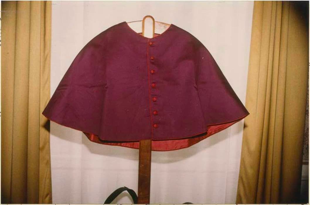 Mozette en tissu violet avec boutons rouges et doublure rouge.