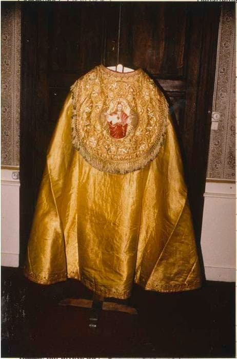 Chape en drap d'or, avec orfrois et dosseret brodés de ramages stylisés et figurine peint à l'aiguille. Franges d'or et doublure rouge.