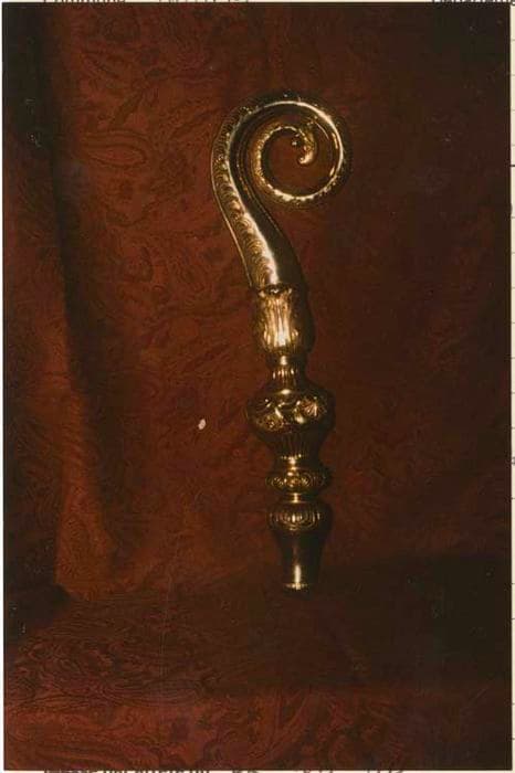 Crosse épiscopale avec trois allonges en métal doré. Hampe cylindrique lisse avec ressauts décorés. Base du crosseron lisse s’évasant, terminé par des feuilles stylisées. Collerette renflée ornée de palmettes. Noeud ovoïde, chargé de cannelures à la base et décoré de feuillages stylisés au sommet. Crosseron à la base cylindrique frappée de feuilles d’acanthes stylisées. Volute ornée de motifs végétaux.