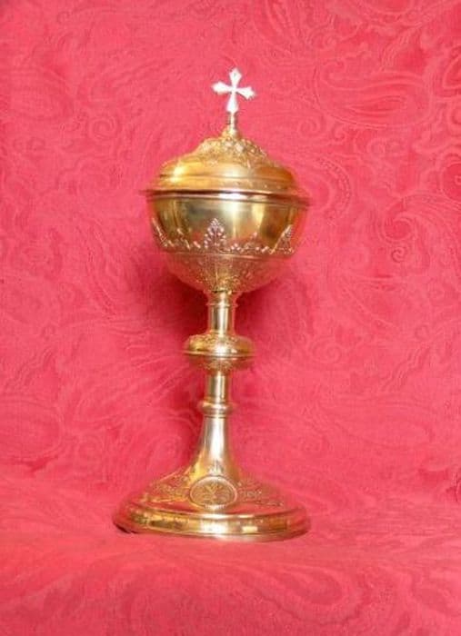Ciboire néo-gothique en métal doré. Pied rond, dessus bombé avec trois médaillons ovales perlés, chargés d'épis de blé, de grappes de raisin feuillées, et de masses de roseaux, séparés par un motif de rinceaux. Collerette basse fine unie. Noeud plat décoré d’un petit motif. Fausse coupe, la partie haute en forme d’ondulations. Cuve unie. Couvercle bombé orné de motifs et sommé d’une croix biseautée.