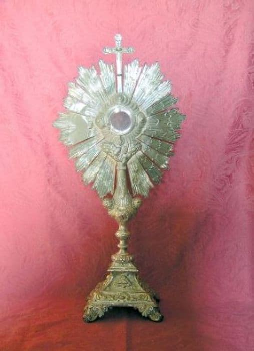 Ostensoir en argent (avec lunule). Pied à volute feuillagée supportant une base rectangulaire avec bandeau de rinceaux et chargée de motifs et deux cartouches sur les petits côtés. Petite base festonnée surmontée d’une couronne décorée. Collerette basse striée en biais. Noeud en forme d’urne chargée de fleurs d’eau. Base du fût renflée et cantonnée en chef de deux têtes d’anges. Fût cannelé sommé d’une gerbe de blé et d’un sarment de vigne. Nuées chargées de deux têtes d’anges en chef et d’une tête d'ange de chaque côté. Entourage de la monstrance perlée dorée. Gloire à rayons droits, surmontée d’une croix latine ornée de rinceaux fleuris en coeur et de perles dans la partie basse.