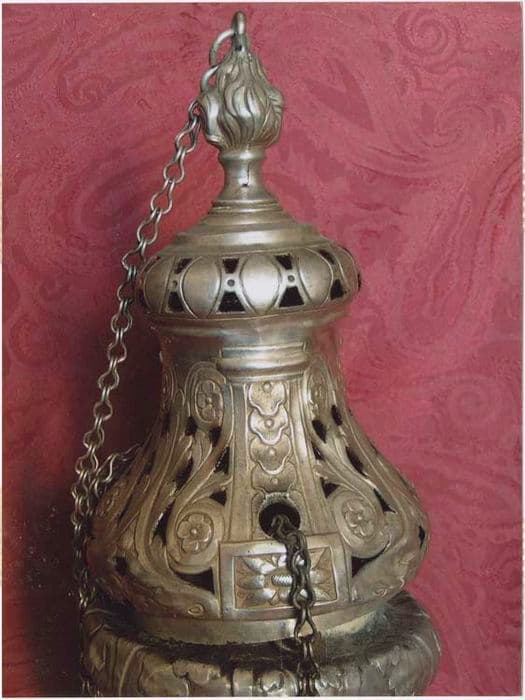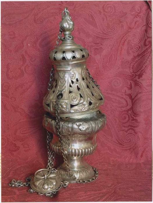 Encensoir en argent. Pied rond décoré de feuilles d’eau. Cuve en forme d’urne bordée de godrons et ornée de quatre motifs dans un cartouche rectangulaire, la partie haute ornée de feuilles stylisées. Cheminée ajourée avec un décor de feuillage en volute et trois bandes formant cartouche chargées d’une natte de feuillage. Partie haute constituée en couronne ajourée, le tout sommé d’une flamme.