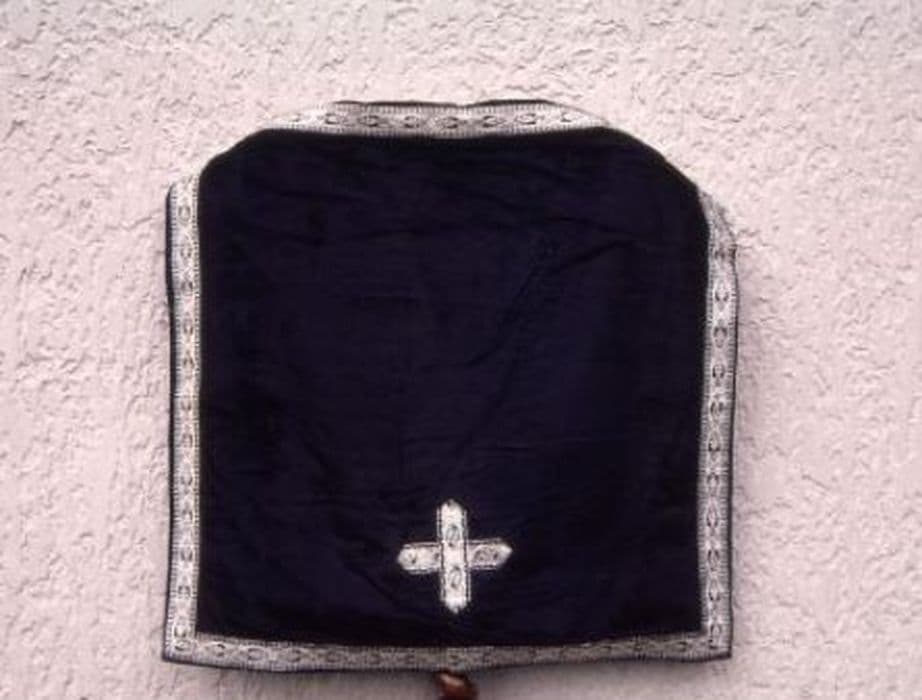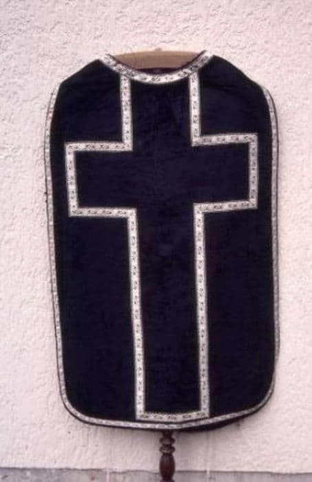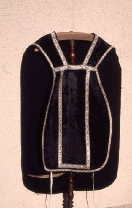 Chasuble en satin brillant noir. Orfroi et croix dessinés par passementerie de soie blanche chargée de feuilles de chêne dans un ovale noir et aux bordures chargées de petits carreaux noirs. Doublure satin noir. Etole, manipule de forme triangulaire et voile de calice assortis à la chasuble, chargés d'une croix aiguisée de passementerie. Franges en fils noirs et blancs.