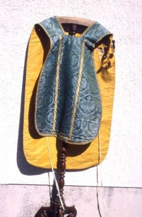 Chasuble en damas vert. Orfroi et croix dessinés par passementerie verte chargée de quintefeuilles dans ovale formé par deux palmettes, le tout doré. Doublure bouton d'or. Etole, manipule de forme triangulaire, et voile de calice en damas vert, assortis à la chasuble, avec broderies de passementerie, croix aiguisée de passementerie et franges de coton vert et jaune.