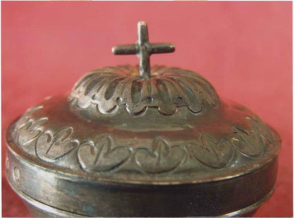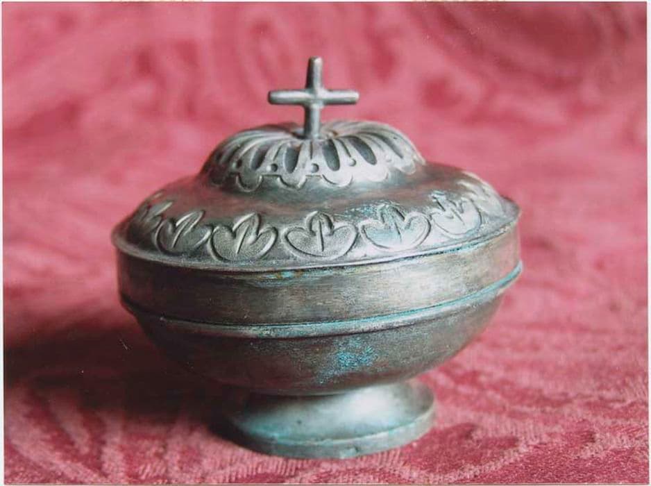 Ciboire des malades en argent, dit pyxide. Base circulaire lisse. Cuve lisse. Couvercle en léger chapeau de gendarme bordé d’une frise de feuilles à trois pointes ; en coeur godrons rayonnants. Croix simple.