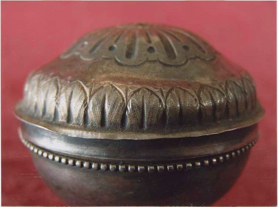 Ciboire des malades en argent, dit pyxide. Base circulaire lisse. Cuve lisse bordée d’un filet perlé. Couvercle en léger chapeau de gendarme bordé d’une frise de feuilles d’acanthe ; cœur circulaire strié rayonnant de traits réguliers.