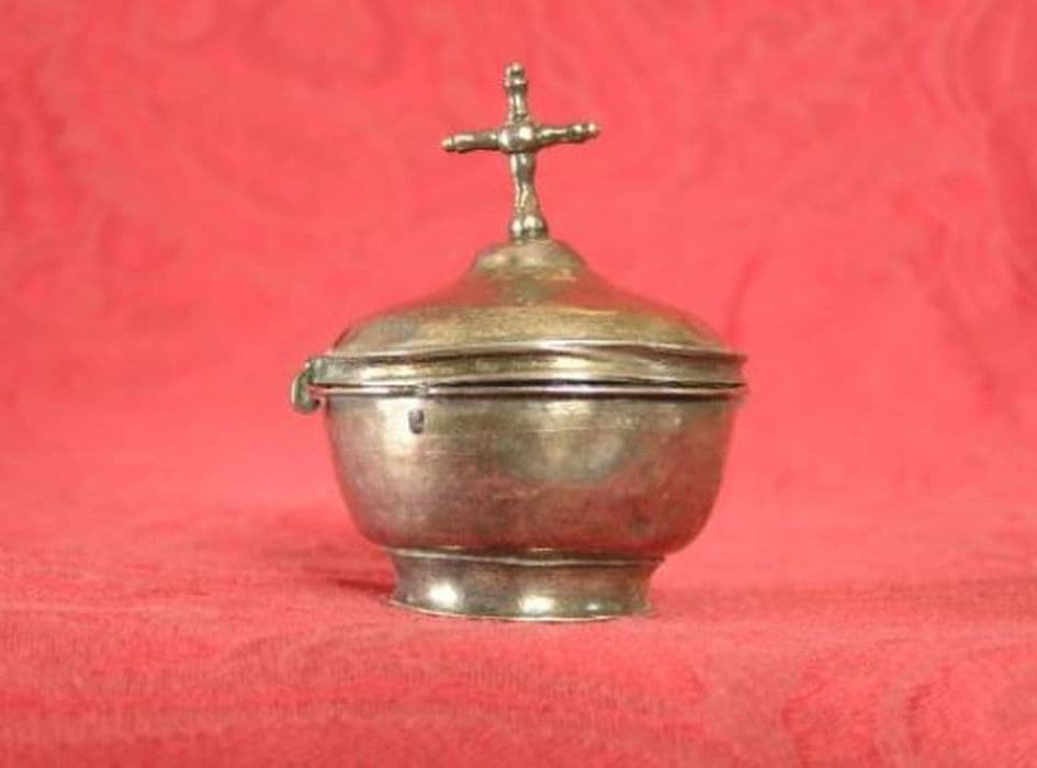 Ciboire des malades en argent, dit pyxide. Base circulaire lisse. Cuve lisse bordée d’un filet perlé. Couvercle bombé lisse fixé par des crochets. Croix bourdonnée.