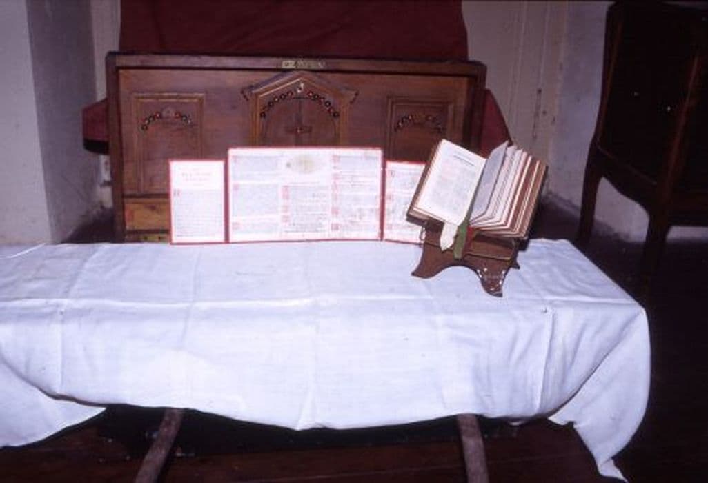Cantine en bois renforcée avec coins en laiton et attaches en cuir. Aménagement d'un autel portatif avec bac pour recevoir les objets du culte et les ornements liturgiques.