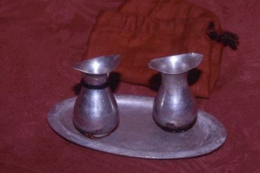Ensemble en aluminium pour le lavement des mains, comprenant un plateau ovale et deux burettes.