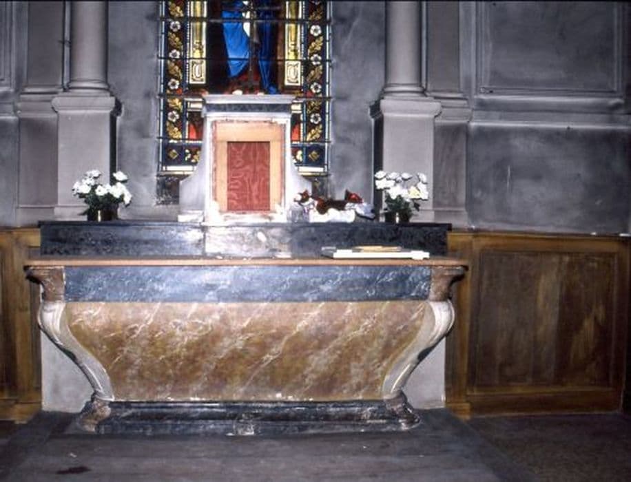 Autel de forme gondole en marbre caramel veiné de blanc souligné à la base et à la partie haute de marbre noir veiné de blanc et aux angles en marbre blanc mouluré au pied et à la tête en marbre caramel. Gradin en marbre caramel avec bordure en marbre noir veiné.