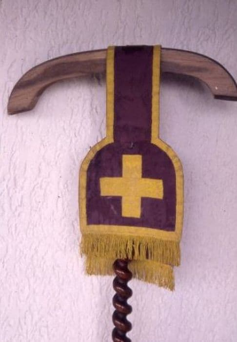 Chasuble et manipule en damas violet et doublure cramoisi. Orfrois et croix de la chasuble dessinés par passementerie droite à figures géométriques à huit cotés en coton jaune doré. Ornement et franges en coton jaune doré sur le manipule.