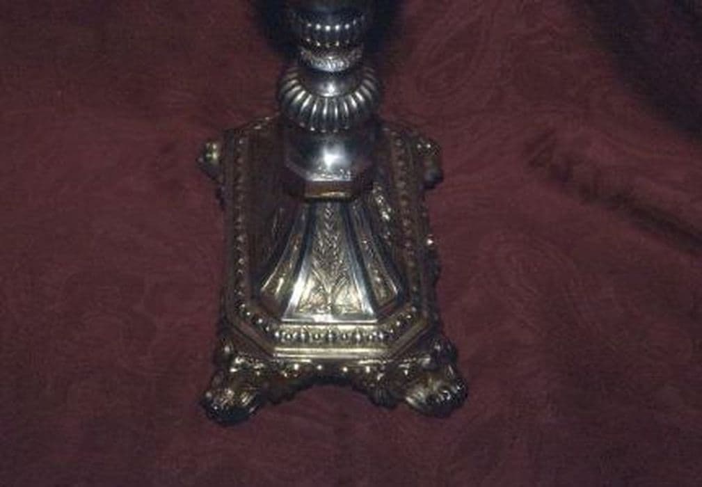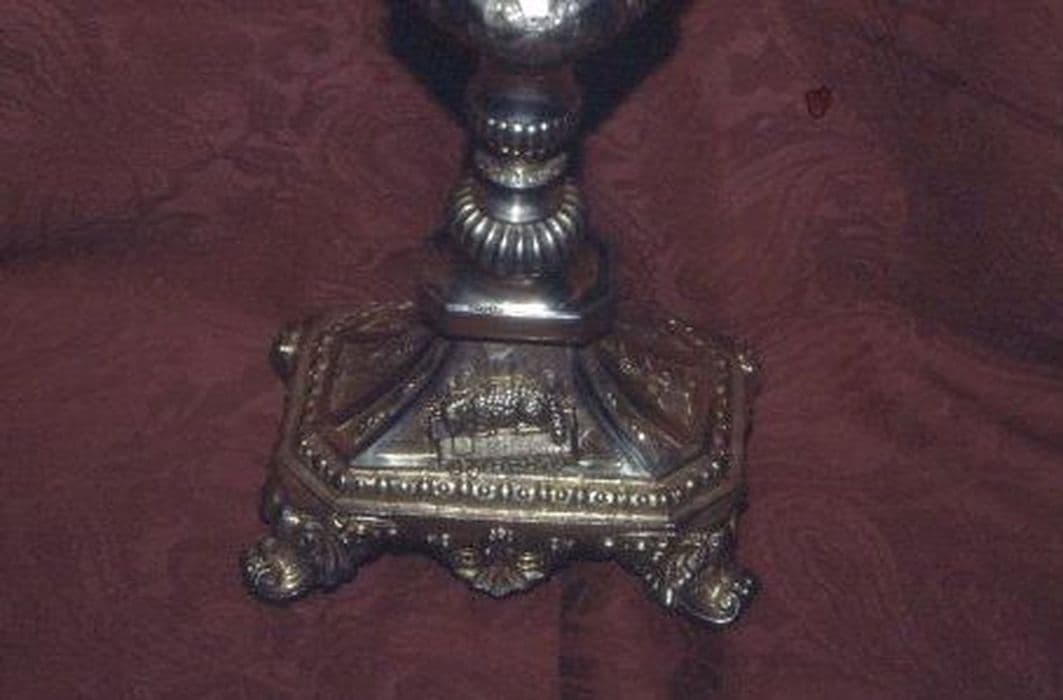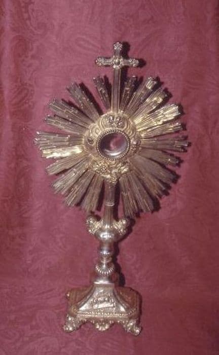 Ostensoir en argent doré sur pied à volutes reliées par un décor végétal avec une coquille centrale. Dessus pyramidal tronqué à coins coupés souligné par une frise perlée. Grosse collerette godronnée à la partie basse. Fine collerette. Noeud en forme d’urne à godrons sur la partie basse, gravé sur la partie haute, cantonnée de têtes d’anges. Fût cannelé terminé en bouquet d’épis de blé et de grappes. Monstrance perlée entourée de nuées chargées de quatre têtes d’anges. Gloire à rayons droits. Croix trilobée.