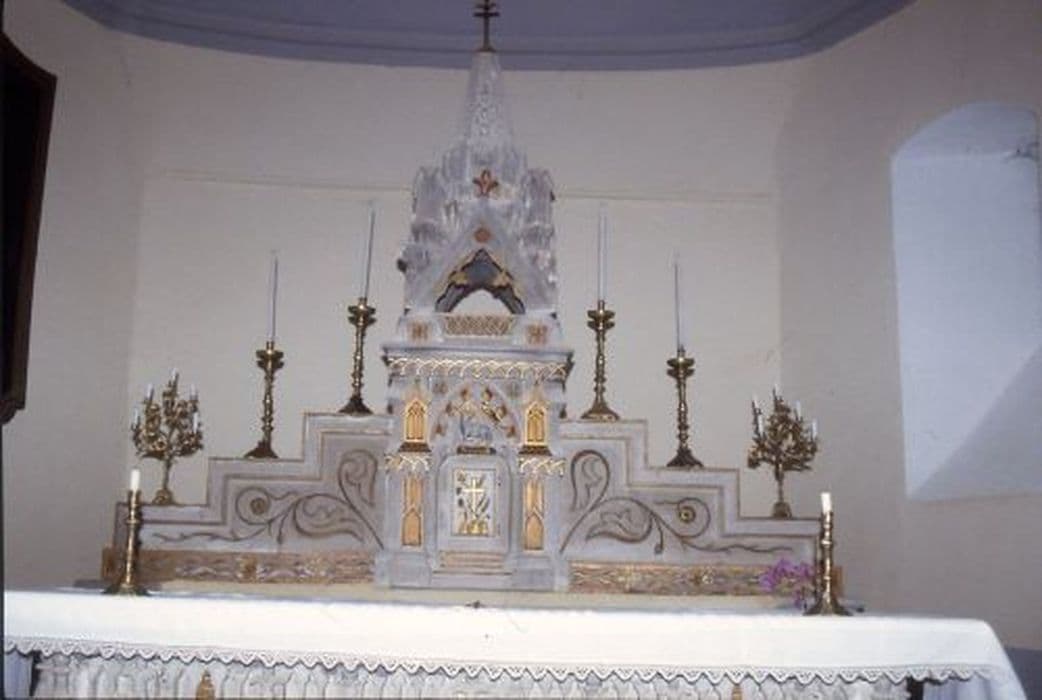 Autel néo-gothique en pierre à cinq enfeus frappés d’une croix grecque trilobée d’or, et angles en forme de pinacle, surmonté d'un gradin en forme d'escalier sur trois niveaux encadrant le tabernacle. Le gradin est décoré d’une frise dorée à la partie basse et de rinceaux gravés aux niveaux supérieurs. Tabernacle droit à deux colonnettes lisses sommées d’un chapiteau corinthien soutenant une voûte d’ogive.