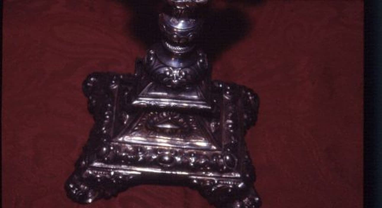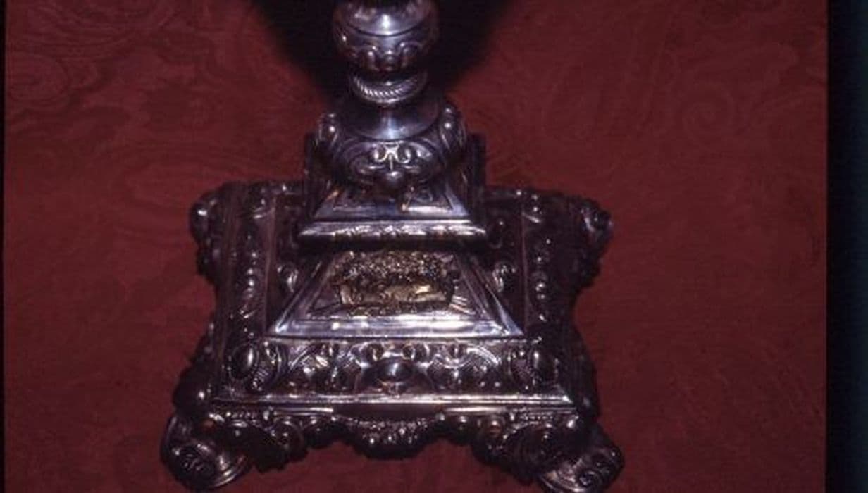 Ostensoir en argent sur pieds à volutes. Base rectangulaire ornée d’une bordure de rinceaux et d’opercules en coeur et en coins. Importante collerette basse ornée. Collerette supérieure striée en biais. Noeud en forme d’urne, godronnée à la partie basse. Fût cannelé terminé en gerbe de blé. Gloire à rayons droits. Croix latine trilobée.