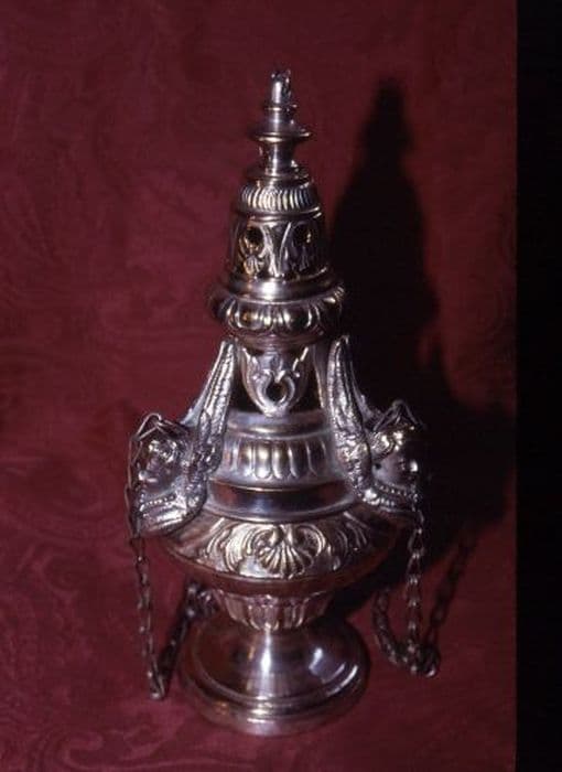 Encensoir en métal argenté sur base circulaire lisse. Cuve en urne à décor géométrique sur la base et coquille stylisée sur le pourtour. Cheminée circulaire à motif de godron sur la partie basse, motif de feuille ajourée sur la partie médiane, tour à étage décorée et ajourée à la partie haute. Trois têtes d’anges en guide chaîne au milieu.