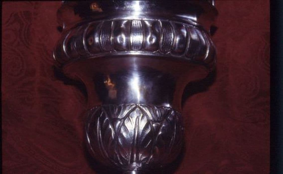Cuve à aspersion en métal argenté. Base circulaire lisse. Cuve en forme d’urne décorée de larges feuilles à la base et large collerette de grosses barres à la partie haute. Poignée travaillée.