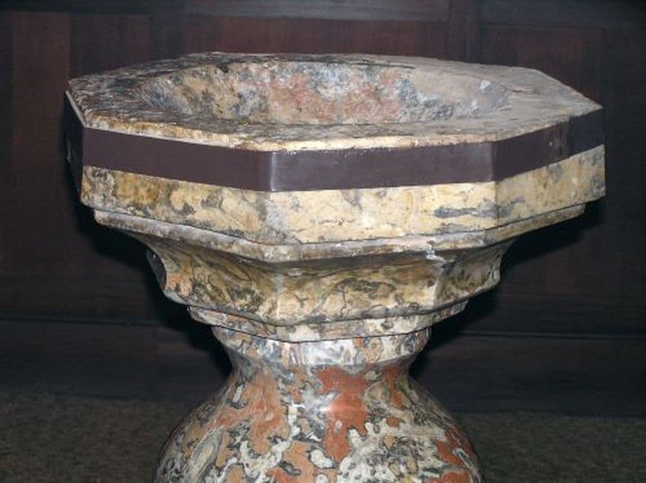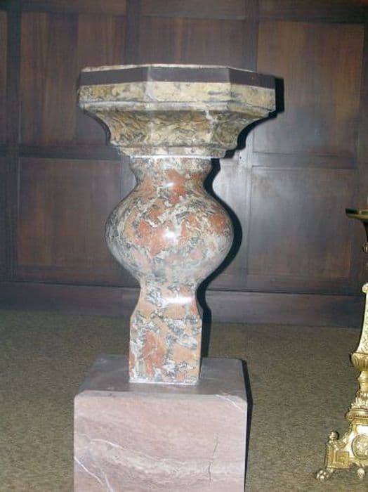 Bénitier en marbre rose, gris et blanc. Cuve à six pans sur fût carré au pied et de forme ovoïde à la partie supérieure reposant sur une base carrée.